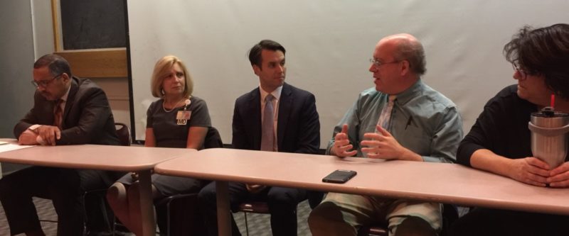Panelists L to R: Wayne Tuckson, President, Greater Louisville Medical Society and Colorectal Surgeon; Barbara Casper, MD, Internist and Professor of Medicine; State Senator Morgan McGarvey, KY 19th; Charles Kodner, MD, Family Medicine; Karen Berg, MD, Diagnostic Radiology and recent candidate for the state senate in the 26th district.