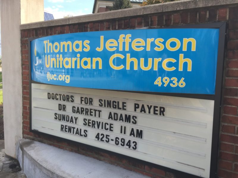 IMG_1866 ‹ Return to Dr. Garrett Adams Gives Single Payer Sermon at TJ Unitarian Church Posted on October 28, 2018 by Kay Tillow The sign outside the church. Garrett and the pumpkin that celebrated the season. Share and Enjoy !Shares