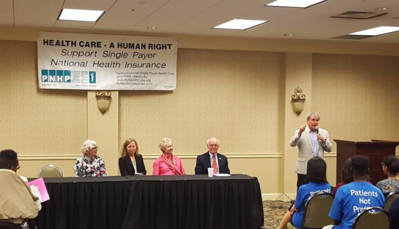 Congressman John Yarmuth, a cosponsor of HR 676, speaking at the October 4 public event. Seated (l to r) are Dr. Carol Paris, President of Physicians for a National Health Program, Dr. Margaret Flowers, Kay Tillow, Chair, Kentuckians for Single Payer Health Care, and Dr. Garrett Adams, Founder of Physicians for a National Health Program-Kentucky. Not pictured is Ann Hagan-Grigsby, CEO of Park DuValle Community Health Center who also spoke.