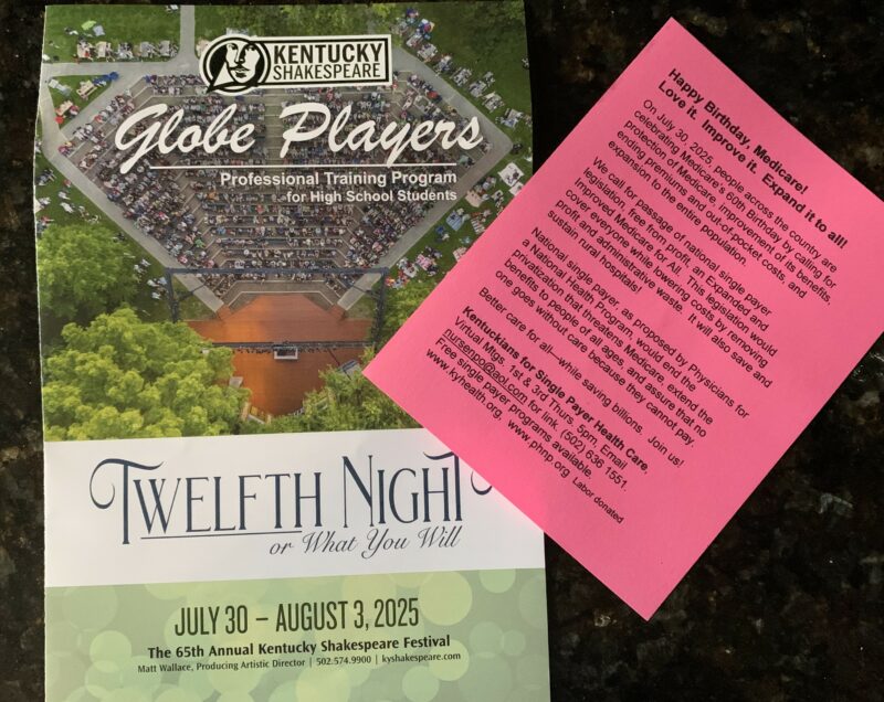 It was Twelfth Night in Louisville’s Central Park when Shakespeare enthusiasts gathered despite the heat and humidity. Medicare lovers were there as well to celebrate Medicare’s 60th Birthday with the distribution of flyers advocating the enactment of an Enhanced Medicare for All. People agreed, pocketed the leaflets, and signed the petition.